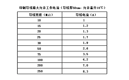 铜线的宽度应根据其能承载的电流进行设计。铜线的载流量取决于以下因素:线宽、导线厚度(铜铂厚度)、允许温升等。下表给出了铜线宽度、导线面积和导电电流(军用标准)之间的关系。根据这一基本关系,可以适当考虑导线宽度。